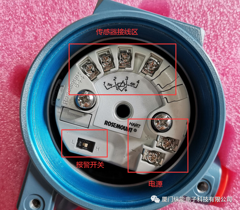 由上圖可看到644帶外殼的變送器,模塊中分為三個(gè)區(qū)域,